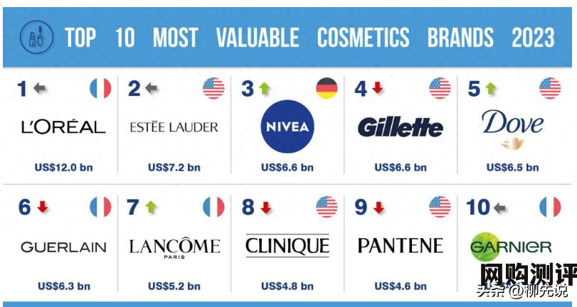 2023全球化妆品和个人护理品牌价值榜单1-5名:欧莱雅、雅诗兰黛、妮维雅、吉列以及多芬。欧莱雅(L'Oreal) 排在榜单第一名,品牌价值120.27亿美元。一百多年来,巴黎欧莱雅在美的领域里不断改造和引领着全世界消费者的方式和观念,品牌精神是“从指尖到发梢”的美丽。产品已从染发剂扩展到女士护肤、彩妆、家用染发、男士护肤以及高档消费品等诸多领域,品牌最大动力正是来源于它把亚洲市场作为今后数年重点开发的目标。