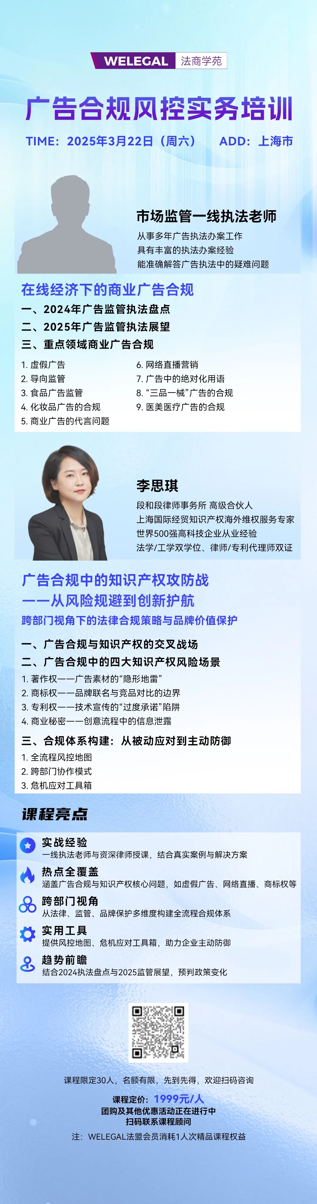 在当今的数字浪潮中,广告行业正在蓬勃发展,但它也面临着越来越复杂的合规性挑战。随着在线经济的兴起,广告形式变得越来越多样化,从传统媒体到在线直播,从食物到医疗美容,广告无处不在。但是,频繁出现的问题,例如虚假的宣传和知识产权侵权,不仅损害了消费者的权利,而且会影响品牌声誉。广告监督和执法将在2024年继续加强,2025年的监管趋势将引起很多关注。在这种背景下,本课程开始了。它着重于在线经济下的商业广告合规性,涵盖了诸如虚假广告,食品广告和在线直播营销等关键领域,并深入分析了广告合规性和知识产权的交集,例如创意版权,品牌联合商标权利和其他风险场景。该课程是由市场监督和管理部门的一线执法教师和高级律师共同教授的,旨在帮助企业建立合规制度,从被动反应到主动防御,以及护送品牌创新和发展。