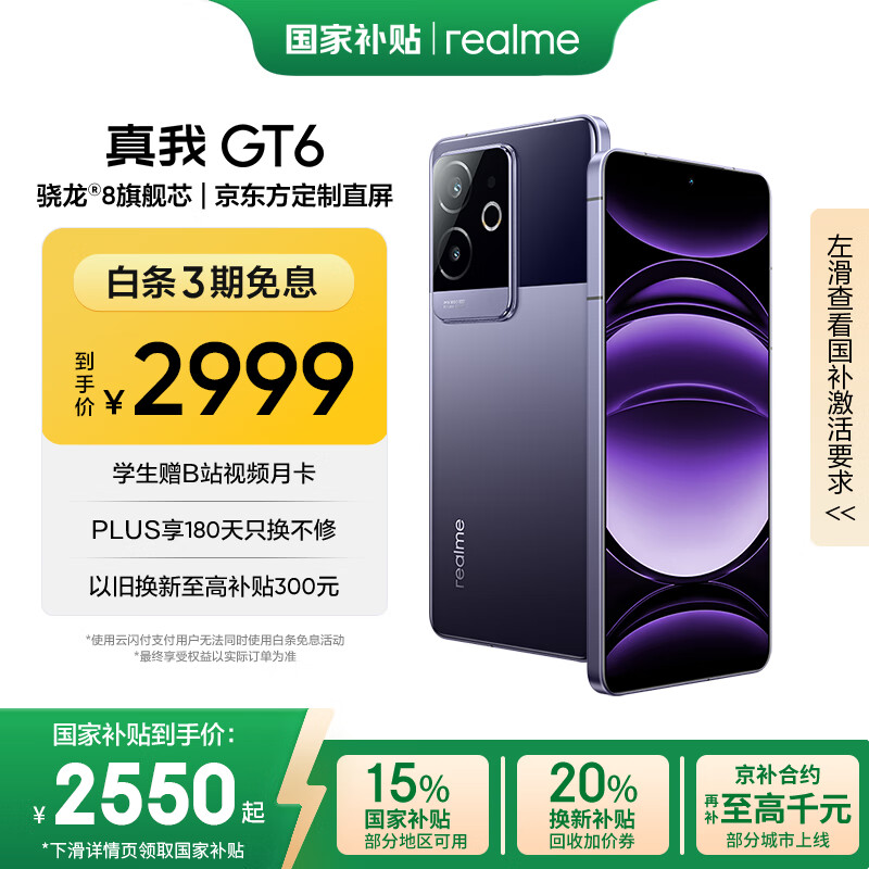 真我GT6获得国家财政支持,搭载骁龙8顶级处理器,配备电竞级直角显示屏,电池容量充足,支持120W极速充电,是一款专为游戏设计的手机,拥有16GB内存和1TB存储空间,呈现风暴紫色外观。