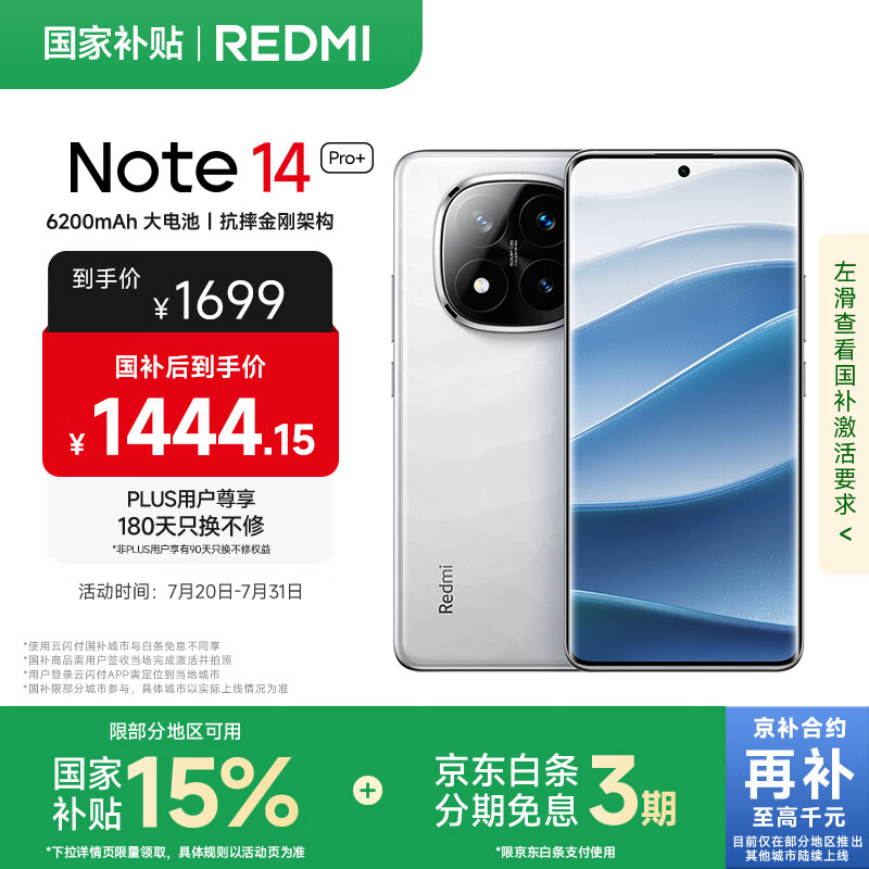 小米旗下REDMI Note 14 Pro+型号,享受国家政策支持,搭载第三代骁龙7s处理器,具备IP68防护等级,拥有大容量电池,内存配置为12GB加256GB,提供镜瓷白配色,属于红米品牌的5G智能手机
