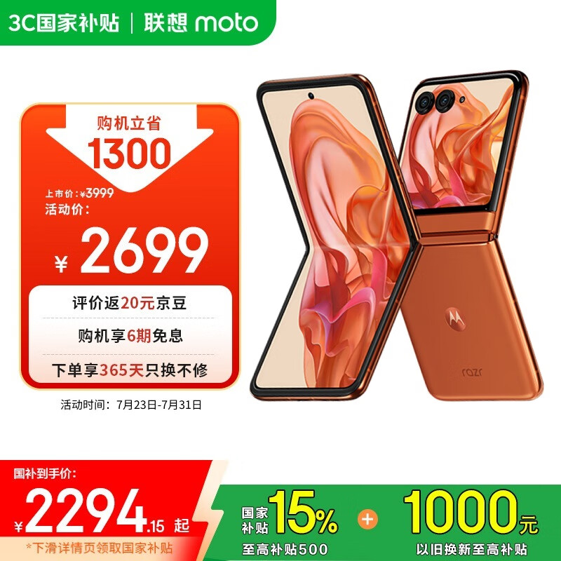 摩托罗拉【国家补贴】这款联想moto Razr 50手机,设计极为轻巧,风格十分时尚,具备多功能大外屏,其可折叠结构通过了60万次的使用认证,支持5G网络和AI功能,存储配置为12GB内存加512GB机身空间,颜色为热爱橙