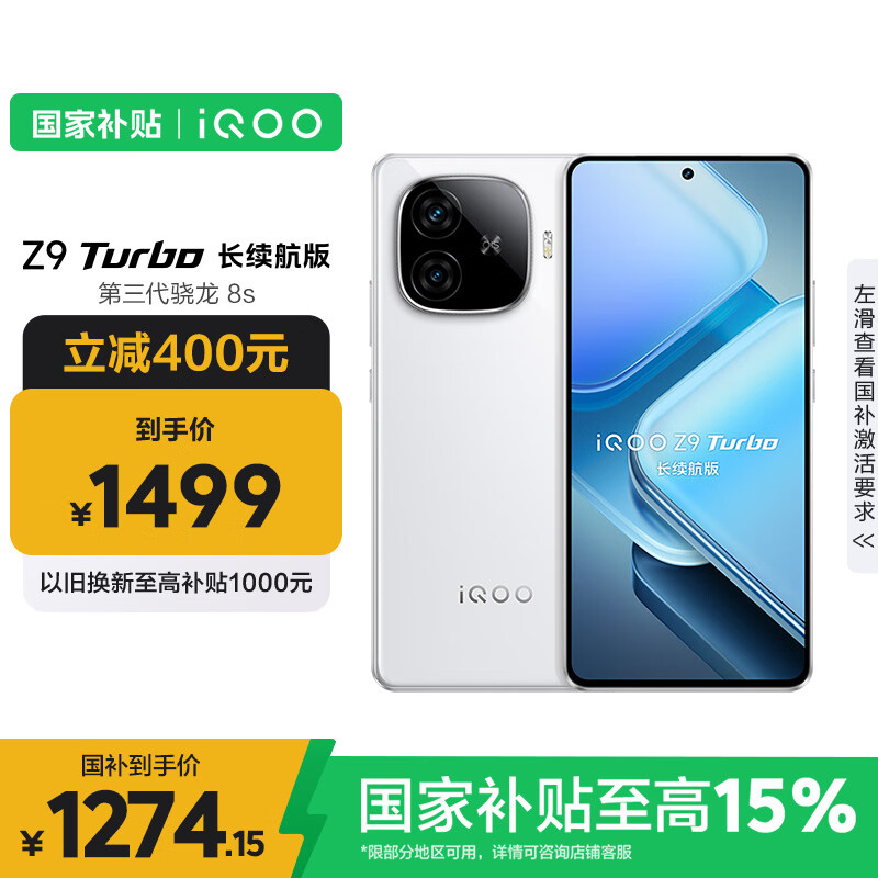 vivo iQOO Z9 Turbo续航增强版,享受国家政策支持,配备12GB内存与256GB存储空间,采用星光白色机身,搭载第三代骁龙8s处理器,拥有强大电池配置,属于电竞性能手机