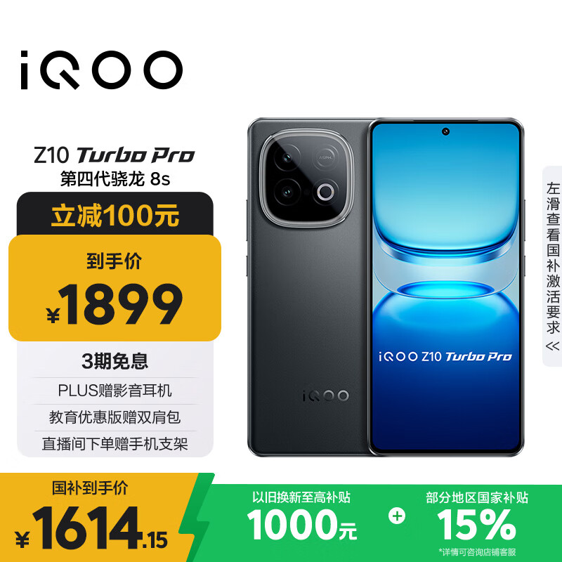 vivo iQOO Z10 Turbo Pro 搭载12GB内存和256GB存储空间 采用星穹黑配色 内部配置第四代骁龙8s处理器 支持高达120W的极速闪充功能 属于电竞性能手机 享受国家相关补贴政策