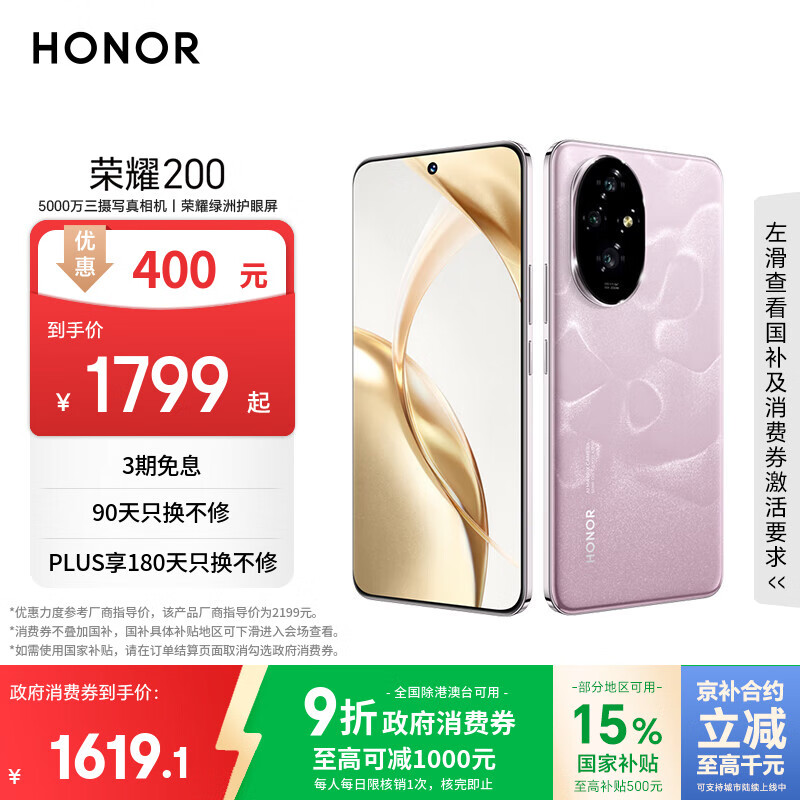 荣耀200 高端青海湖电池, 沐浴护眼屏幕, 精致光影主摄, 12GB内存512GB存储, 珊瑚粉色款, 拍照支持5G和AI, 是一款新式智能手机, 符合国家补贴政策