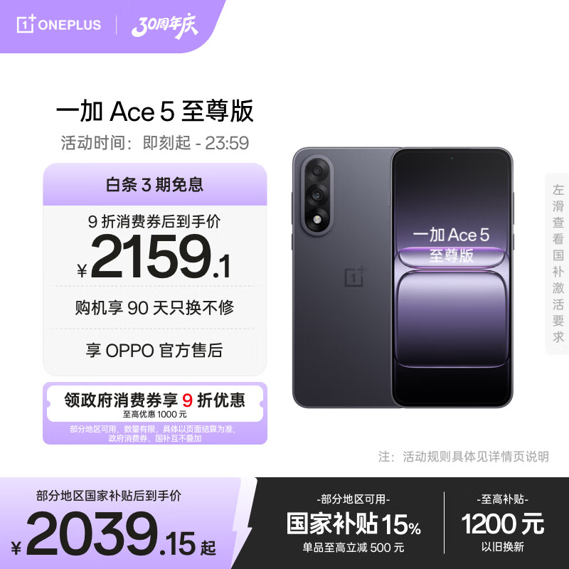一加 Ace 5 至尊版 12GB 256GB 幻影黑 机型搭载天玑 9400 处理器, 配备风驰游戏内核, 拥有 oppo 游戏电竞性能, 符合国家补贴政策