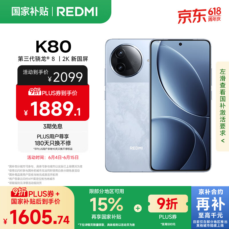 小米旗下REDMI K80第三代采用骁龙8旗舰芯片,配备大容量电池,搭载澎湃OS系统,提供汐月蓝色调,内存配置为12GB加256GB,属于5G网络的红米手机产品