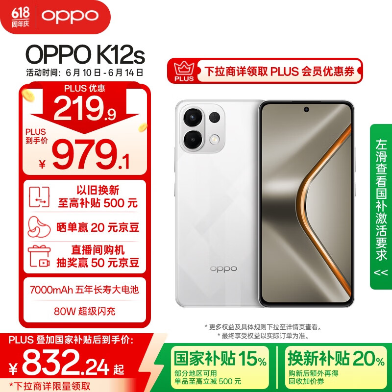 OPPO K12s机型, 8GB内存搭配128GB存储空间, 星芒白色机身设计, 拥有持久续航的大容量电池, 采用OLED材质直屏, 芯片为骁龙处理器, 支持学生优惠, 搭载5G网络技术, 属于游戏性能突出的千元级别新款手机, 享有国家补贴政策