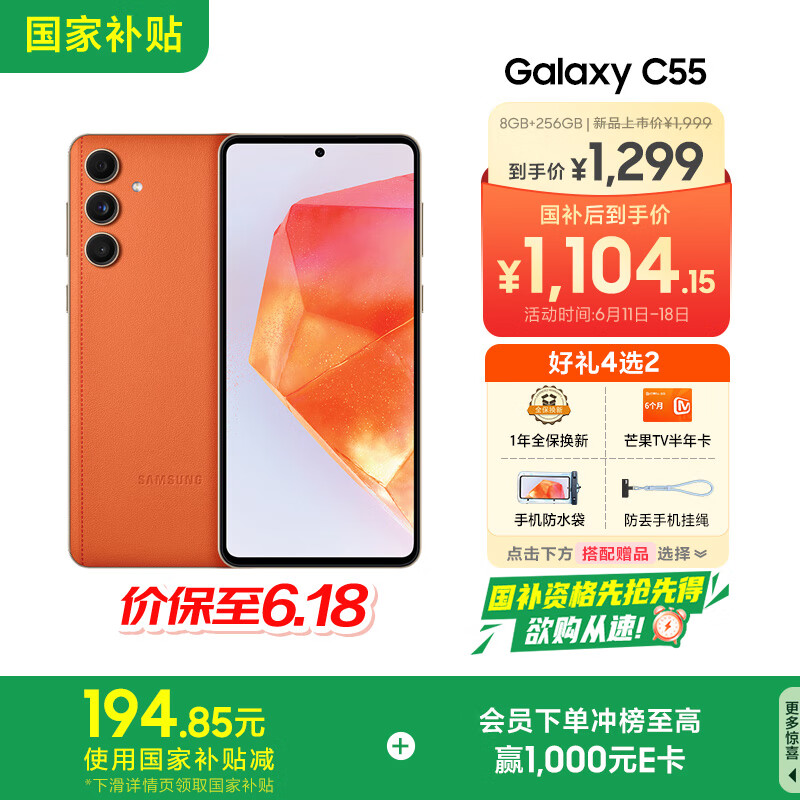 三星 C55 5G机型,配备前后双5000万摄像头,属于拍照专用设备,内存配置为8GB加256GB,提供缤纷橙色选择,适合游戏娱乐需求,享受国家政策支持,给予相应补贴。
