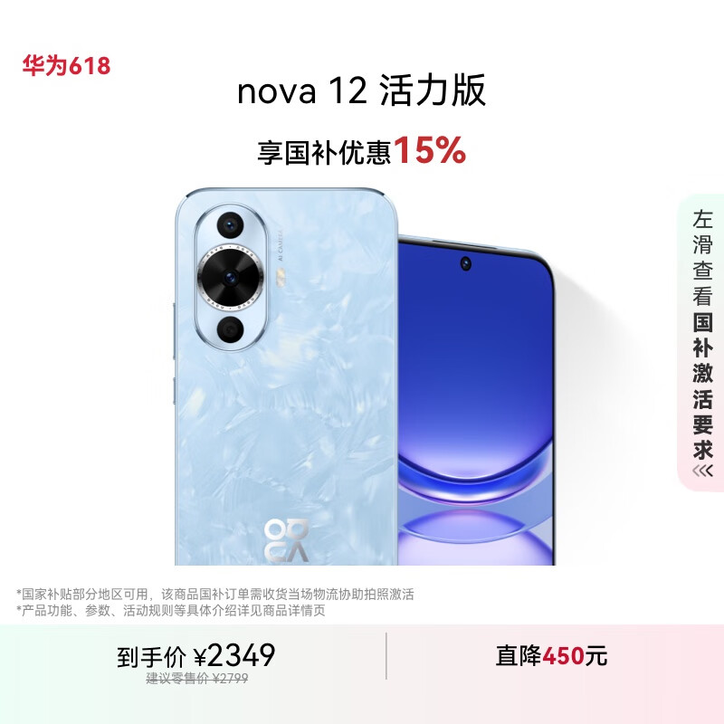 华为nova 12活力版享受国家15%的补贴优惠,机身厚度仅为6.88毫米,配备时尚美观的直屏,正面搭载6000万像素超广角摄像头,存储容量为512GB,提供冰雪蓝色机身选择,是一款基于鸿蒙系统的智能手机