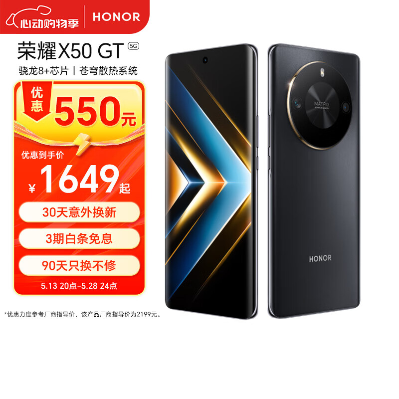 荣耀X50 GT 选用骁龙8+芯片, 搭载苍穹散热系统, 配备大容量电池, 拥有抗摔特性, 屏幕支持护眼功能, 存储容量为12GB+256GB, 颜色为幻夜黑, 支持网络5G, 属于游戏手机系列, 符合国家补贴政策