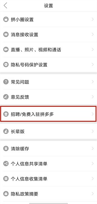 2、在设置界面选择“招聘/免费入驻拼多多”,点击进入。