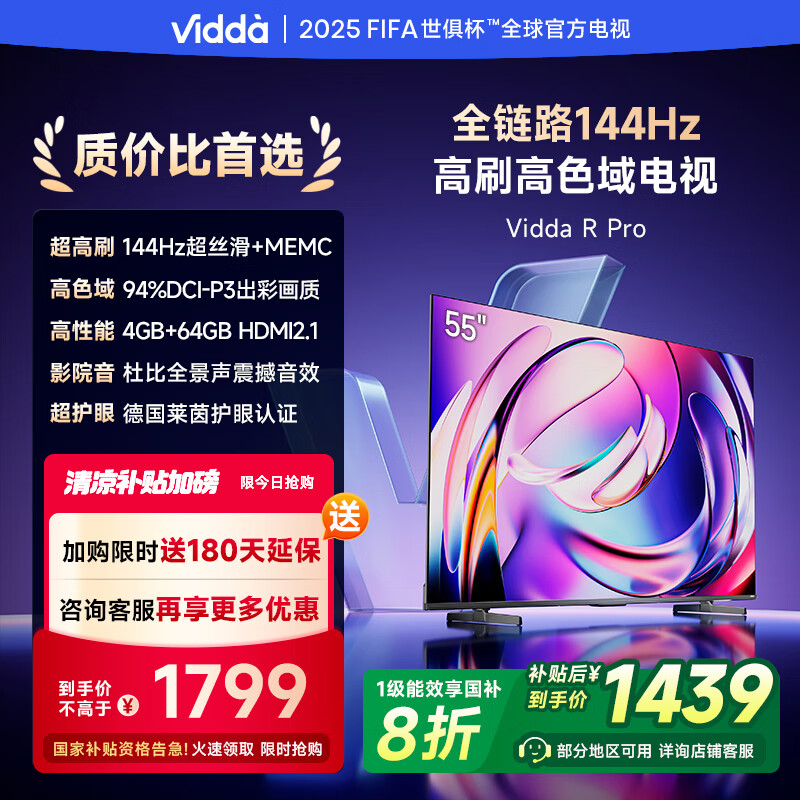 Vidda R Pro 55寸海信液晶电视,144Hz刷新率,4GB+64GB存储,达到一级能效标准,支持以旧换新家电国家补贴,属于游戏专用电视型号