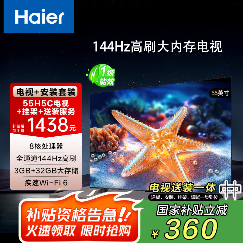 海尔品牌产品,包含固定式挂架,支持安装一体化设计,型号为55H5C,屏幕尺寸55英寸,具备4K超高清分辨率,刷新率144Hz,色彩表现力强,存储容量为3GB运行内存加32GB机身存储,属于游戏专用智能电视,符合一级能效标准