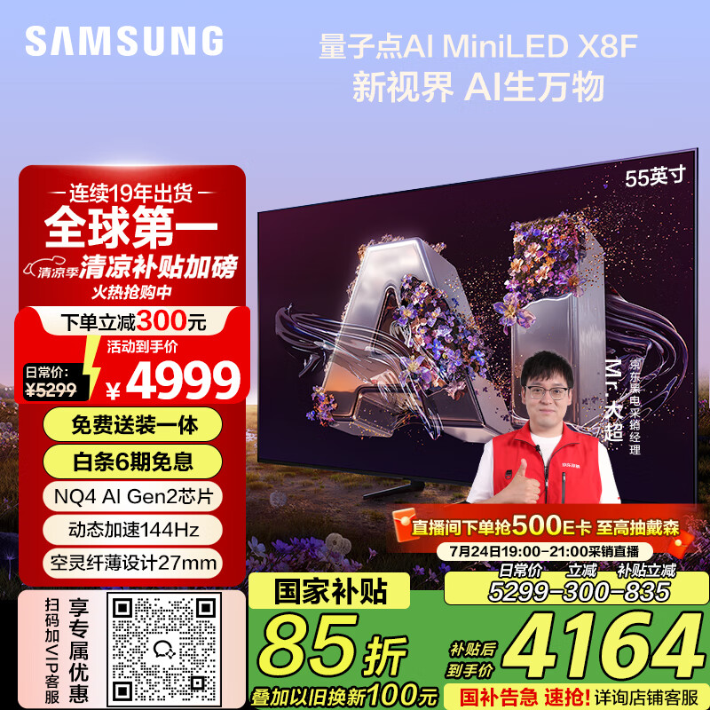 三星55X8F这款55英寸电视采用量子点技术,具备AI Mini LED显示特性,支持艺术电视模式,能够实现超薄平嵌安装,刷新率高达144Hz。