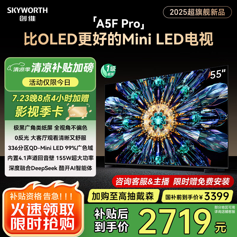 创维电视黑骑士A5F Pro 55英寸QD-Mini LED 显示器性能优异, 超越了 OLED 液晶游戏智能平板, 属于 4K 电视机, 符合家电补贴条件。