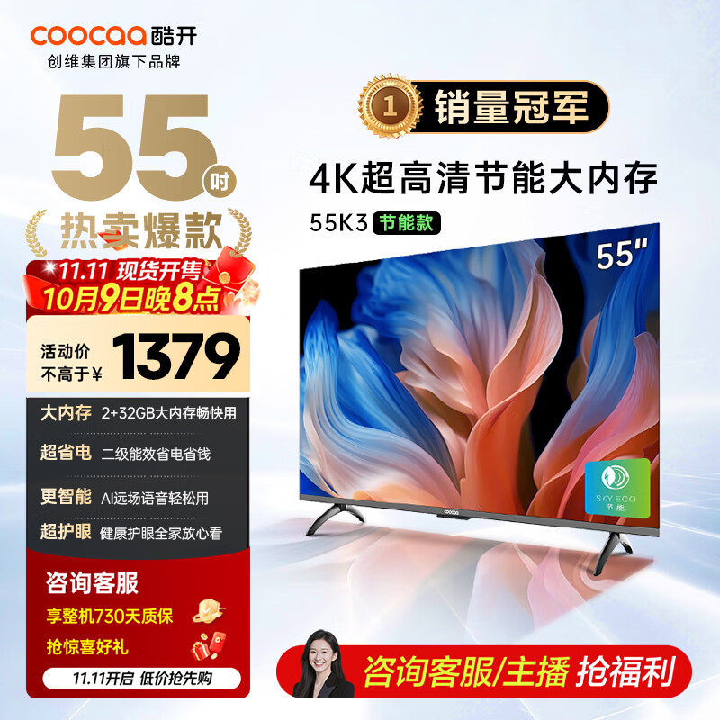 酷开创维55K3节能版 55寸电视 【热销推荐】2GB+32GB AI远场语音支持以旧换新享受国家补贴的智能平板电视