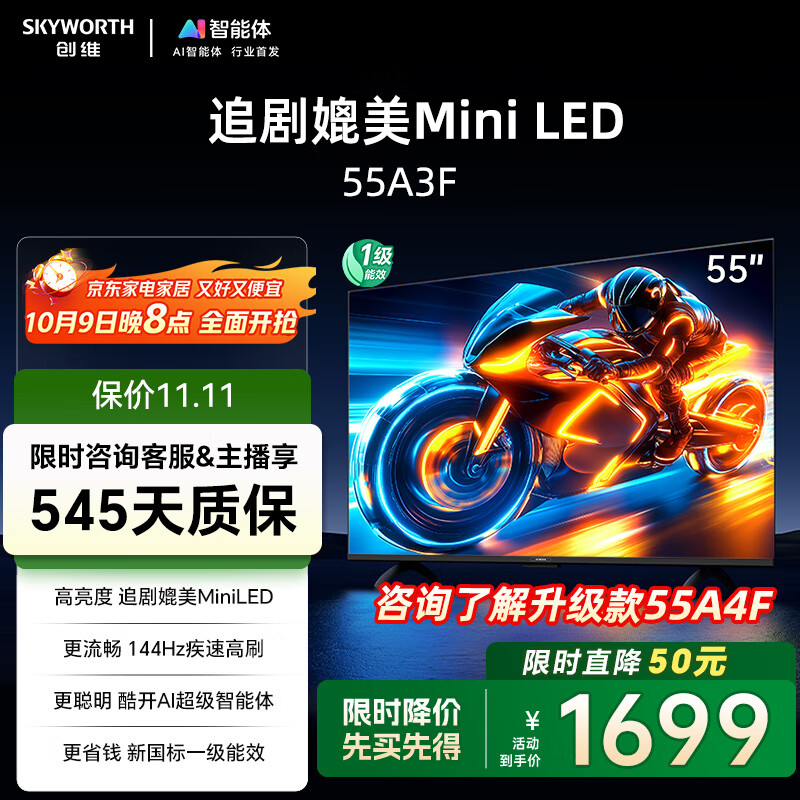 创维电视55A3F,55英寸大屏,达到一级能效标准,144Hz刷新率非常出色,堪比4K液晶游戏智能平板,享受家电国家补贴政策