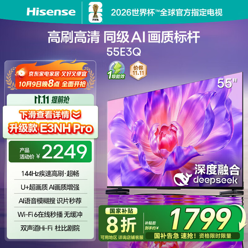 海信电视55E3Q,55英寸,144Hz高刷新率,搭载U+超画质引擎,支持AI智能语音,配备Wi-Fi6功能,采用4k液晶平板技术,享受国家补贴,支持以旧换新政策