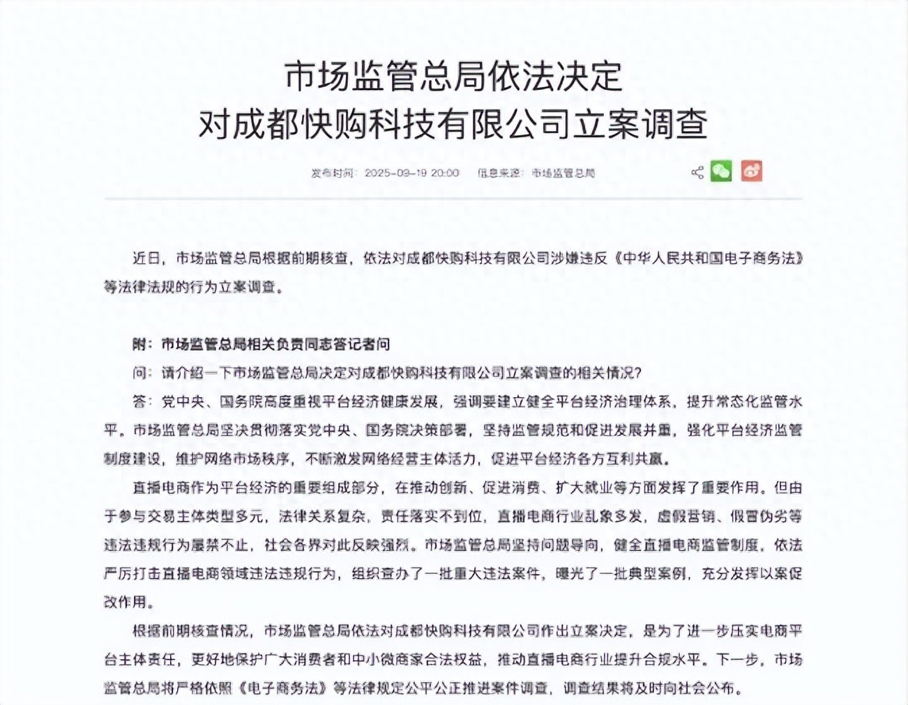 双11促销活动临近之时,9月19日,市场监督管理部门突然采取行动,由于疑似触犯电子商务相关法规,快手旗下成都快购公司被正式立案审查。
