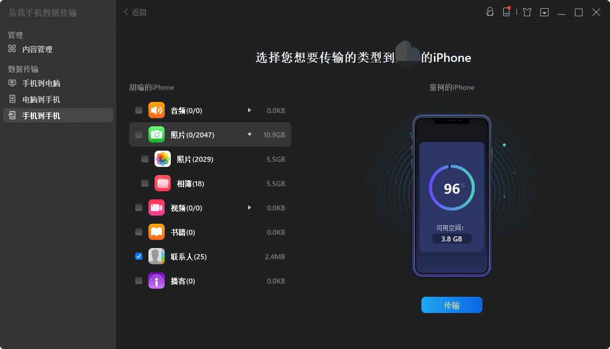 苹果公司推荐的资料转移途径之外,还有其他一些辅助软件能协助您完成资料迁移,例如:易我手机数据传输( ),这是一款专门为苹果设备设计的资料转移工具,它允许用户自主挑选需要转移的资料种类,比如影像、联系人信息、短信记录、通讯簿、音频文件、影音片段等,不妨尝试了解它的具体操作步骤。