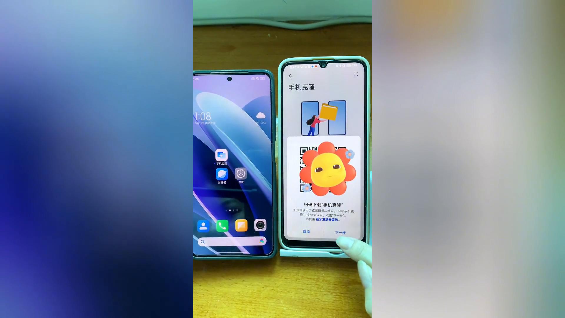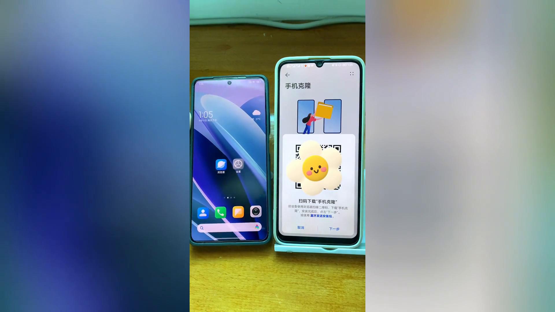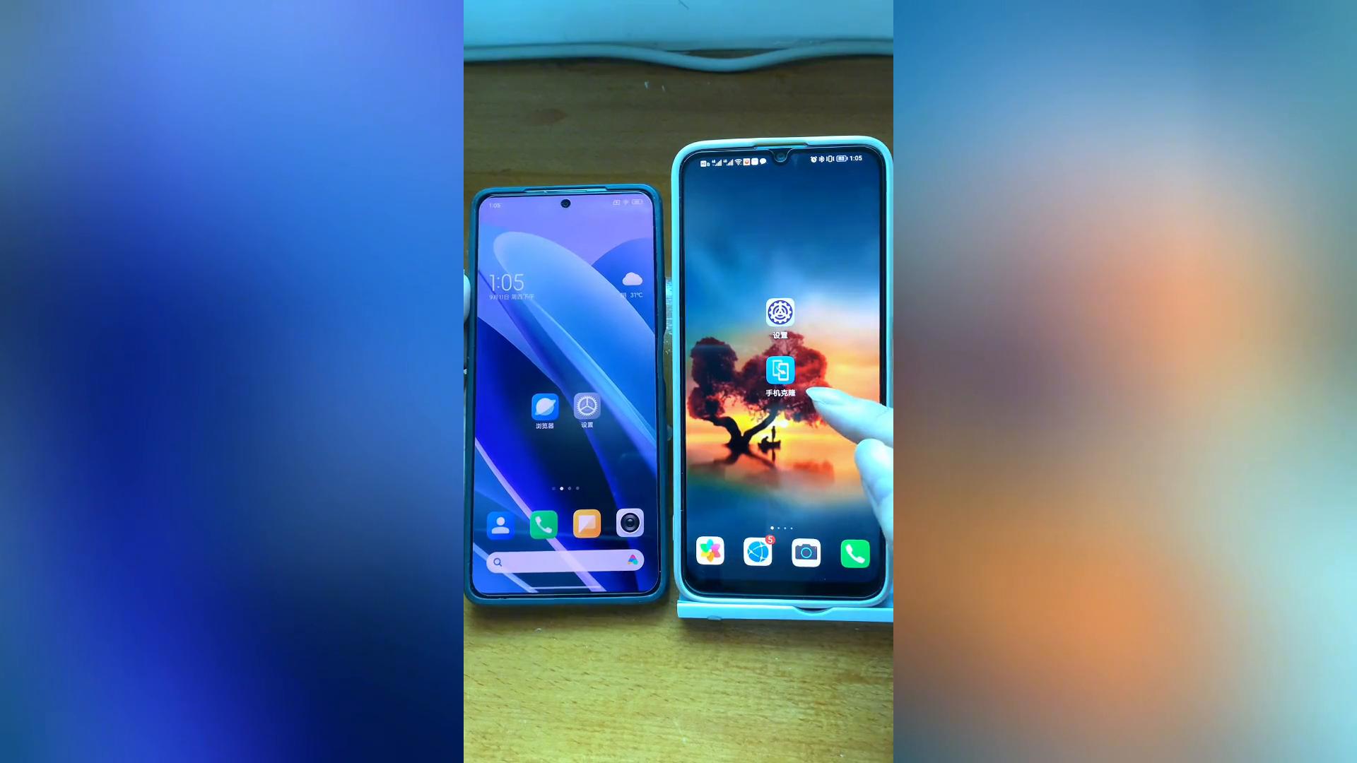 下面我拿两部手机做个示范,看看旧机里的资料怎样直接迁移到新机上,左边那部是小米,右边这部是华为,现在我们假定左边是旧机,右边这部是新机。