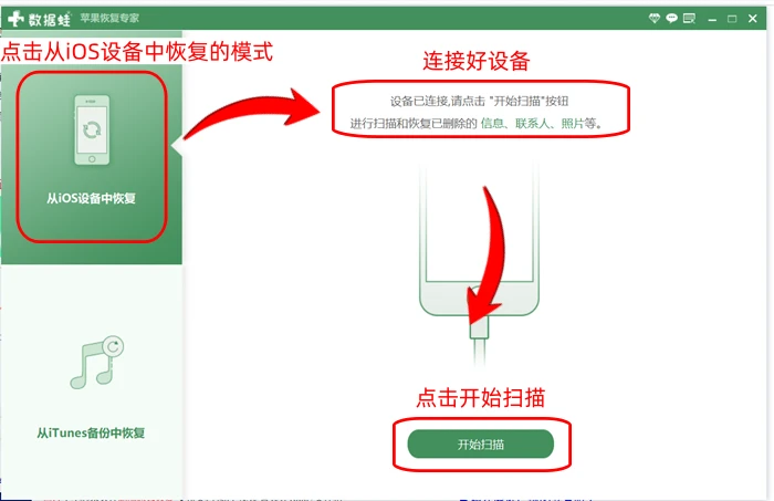 首先,将手机设备与电脑主机建立连接,接着启动【数据蛙苹果恢复专家】软件程序。在主界面上,可以查看到设备连接状态显示为成功,随后按下【开始扫描】的功能键。