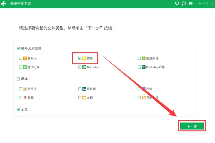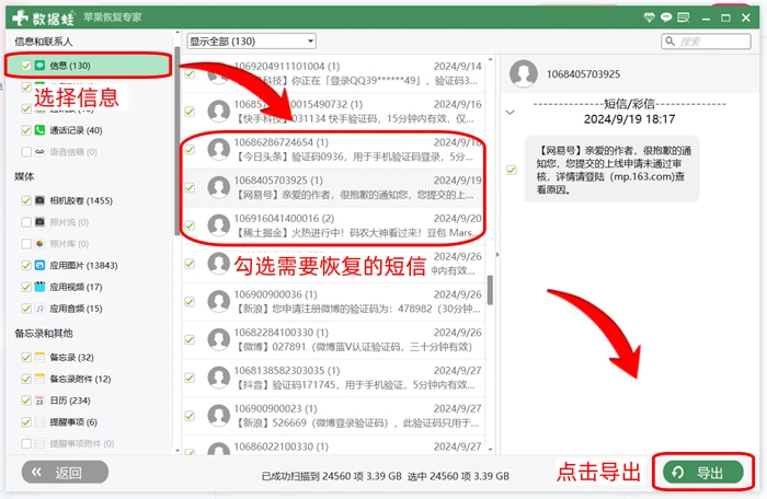 步骤二,需要挑选期望还原的信息,若打算还原苹果手机上的短信内容,就必须选定【短信】,然后进行点击操作。