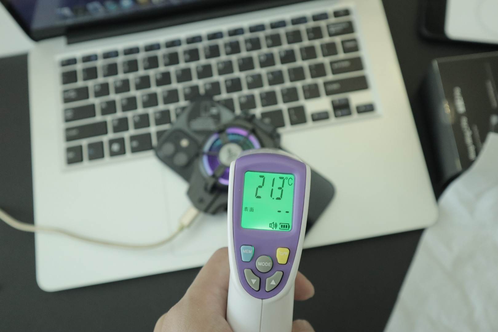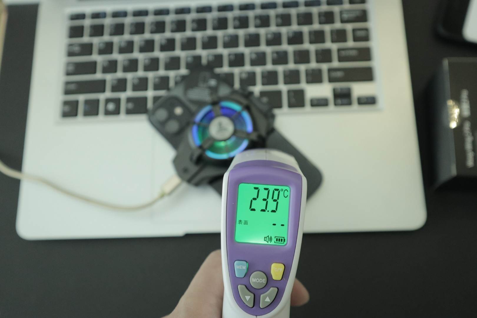 飞智蜂翼2Pro手机散热器使用五分钟后,温度测得为23.9度,该温度下手机手感十分清凉,几乎感觉不到任何热意。
