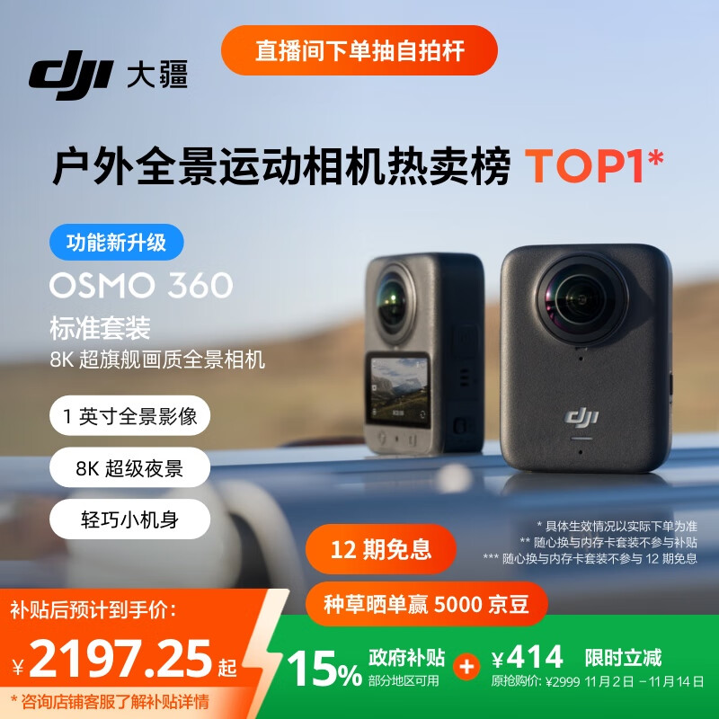 在京东自营的大疆,有新品享受政府补贴,是高清全景且能运动的相机,具备防抖功能,还防水,适用于摩托车骑行、潜水以及滑雪场景 。