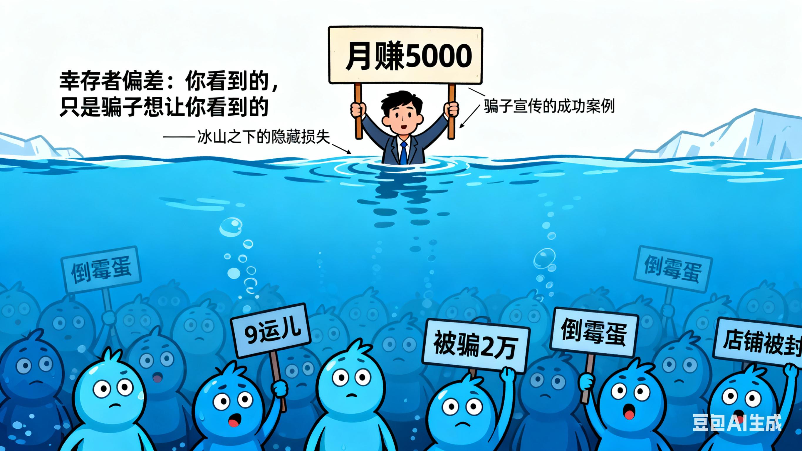但是,他们不会向你讲,其余的999个学员,有的是没有销量,有的是被欺骗钱财,有的是店铺被封禁。你所目睹的是“他人能够成功”,然而却没能瞧见“更多的人无法成功”,就这样才导致你出现“我也能够变成那个幸运之人”的想法。