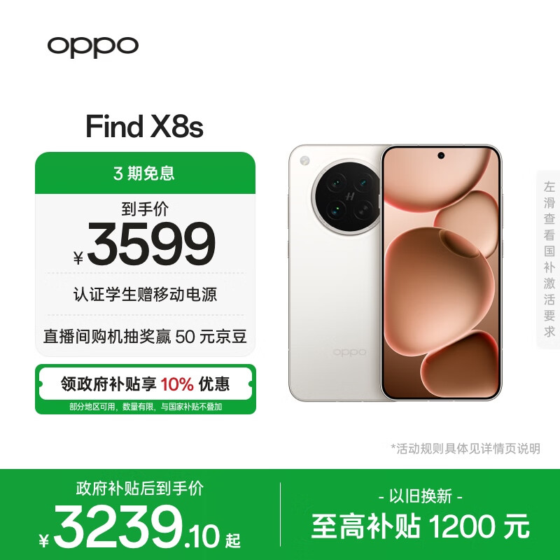 OPPO推出的Find X8s手机,具备16GB运行内存与256GB机身存储,呈现月光白色泽,拥有极窄的四等边设计,搭载天玑9400+处理器,配备哈苏人像拍摄能力,具备能实现超长续航的电池,还拥有AI功能,属于5G手机,享受国家补贴 。