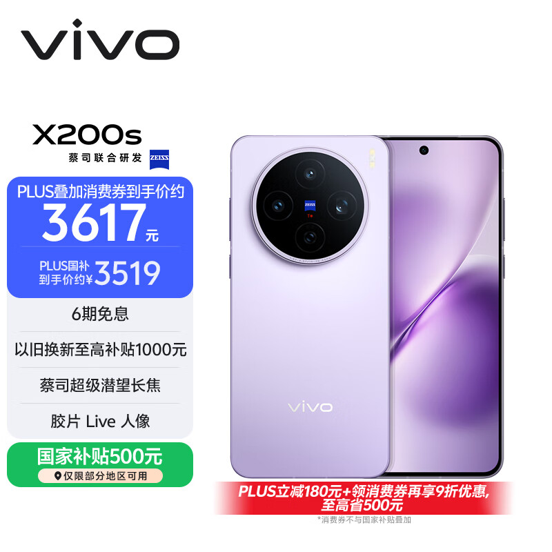 vivo X200s,拥有12GB加256GB存储,颜色为淡紫,具备国家补贴,配备蔡司超级潜望长焦,拥有湿手秒开超声波指纹,带有拍照AI特性的手机 。