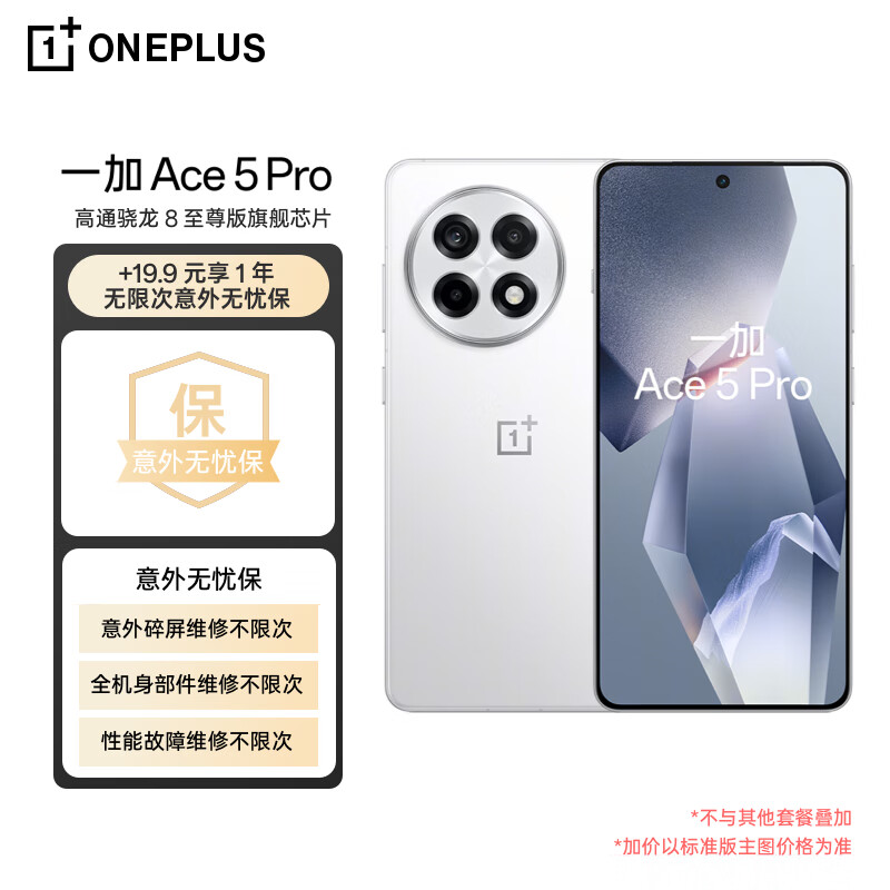 对于一加品牌下的Ace 5 Pro这款智能手机而言,它具备着16GB的运行内存以及512GB的存储容量,其外观呈现为白月瓷样式的陶瓷特别版,并且搭载了骁龙8至尊版处理器来作为核心配置,同时还涵盖了【1年无限次意外无忧保套装】这一服务内容。
