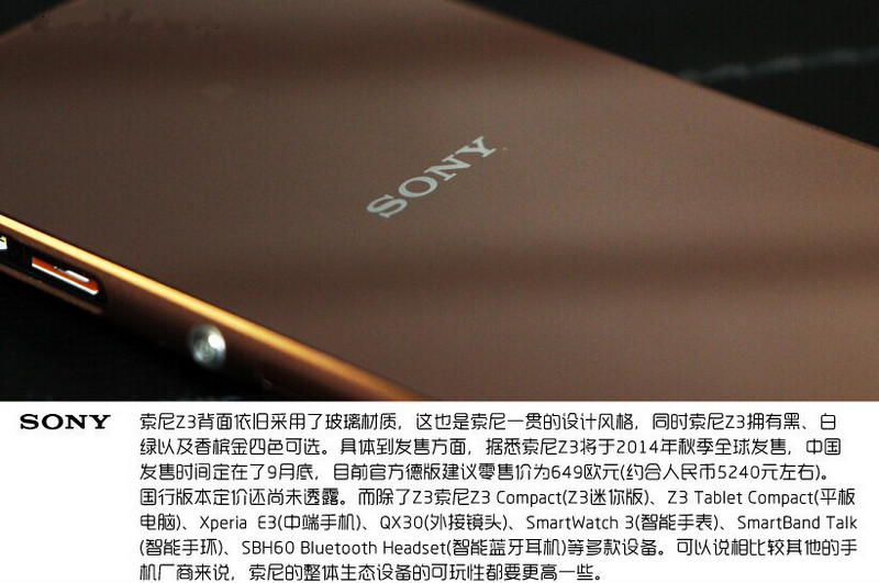 就在不久之前,在IFA展会上,索尼发布了新旗舰Z3 ,于今日,在索尼官网以及京东商城开启预售 ,该产品拥有移动版和联通版两个不同版本 ,其颜色款式存在琥珀金、春雪白、曜石黑这三种颜色 ,还包含四种预售套餐 。下面,小编为大家带来了具有土豪金特色的索尼Z3上手体验图赏 ,一起来看看吧 。