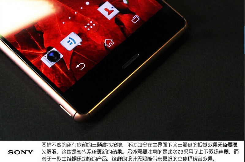 谈及三维尺寸,索尼Z3差不多各削减了1毫米,重量减轻了 11克,如此一来它变得比Z2更轻且更薄,并且呀,它依旧运用了索尼特有的全平衡双面玻璃设计,还配备有高质量金属边框。