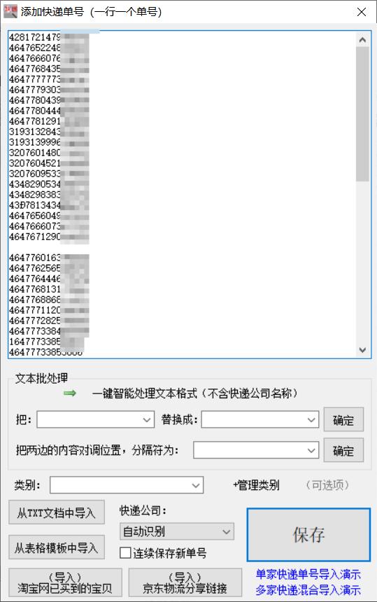 进入软件主界面,找到“添加单号”功能按钮并点击,借助复制粘贴、从TXT文档将单号导入或者通过表格模板导入等办法,将需查询的快递单号一次性批量导入,然后单击保存,这样就能自动查询了。