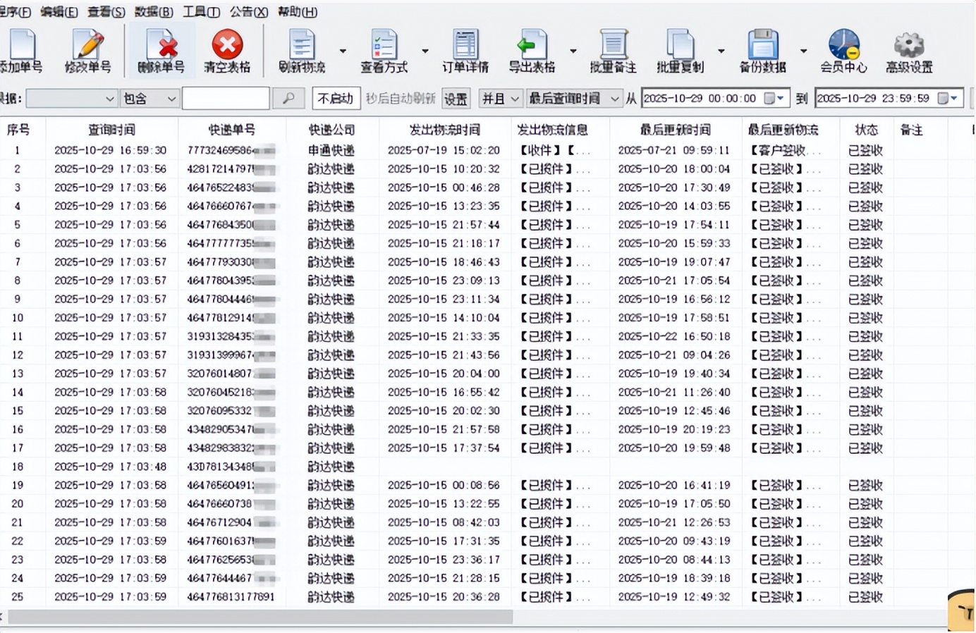 1. 进行物流信息查看:在查询操作完成之后,软件的主界面会呈现出所有单号的详尽物流信息,其中涵盖了发出的时间,还有当前所处的状态,以及最后更新的时间等 。