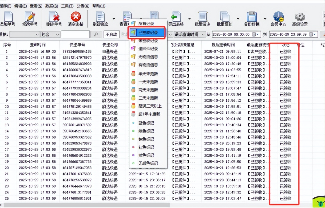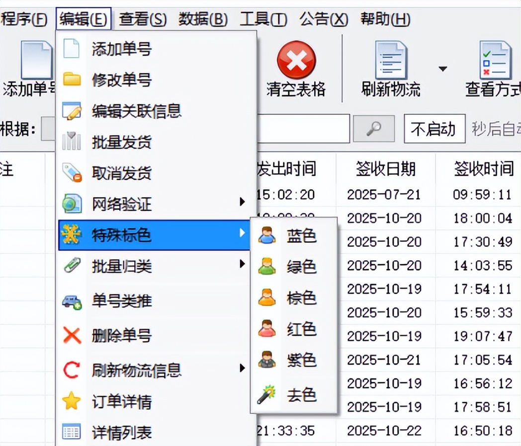 5. 特殊予以标色:针对筛选出来的确已签收的物件进行特殊的标色操作,以此方便后续能够快速地加以识别。当选中单号之后,用右键点击并选择名为“特殊标色”的功能,接着从中选择颜色(像是红色、蓝色这类)来实施标记 。