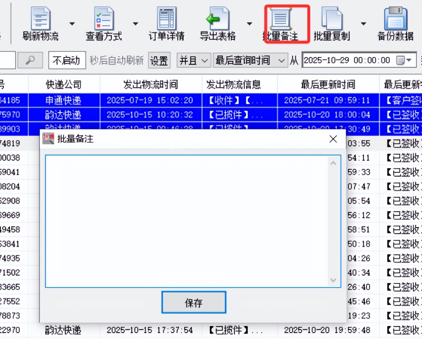 6.进行批量备注,借助“批量备注”功能,针对筛选出来的已签收的物件添加标签,比如“已签收”,以此达成分类管理的目的。