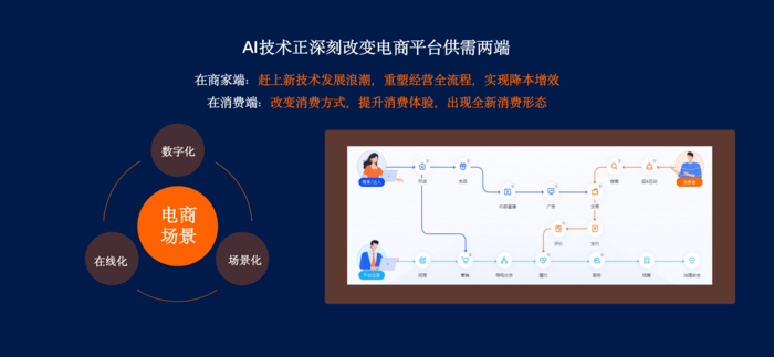 电商行业里,AI能够得到迅速应用,这和电商具备的在线化以及数字化属性紧密相连,不可分割。就像图里显示的那样,不管是消费者的消费行为,还是商家以及电商平台的业务流程,当中重要的节点都能够成为AI应用的具体场景,并且这些场景也给AI应用带来了丰富的想象空间。按照这样的情况类推,未来AI朝着千行百业扩散应用时,在线化、数字化以及场景化将会成为三个必不可少的因素。