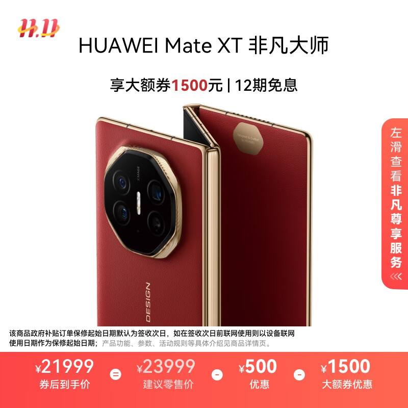 Mate XT非凡大师品牌的那款华为手机,具有三折叠屏特征,内存是16GB加上1TB这一规格呈现瑞红样子,其具备超纤薄特点,有着岩脉纹理样式,拥有10.2英寸超形态的三折叠大屏 。