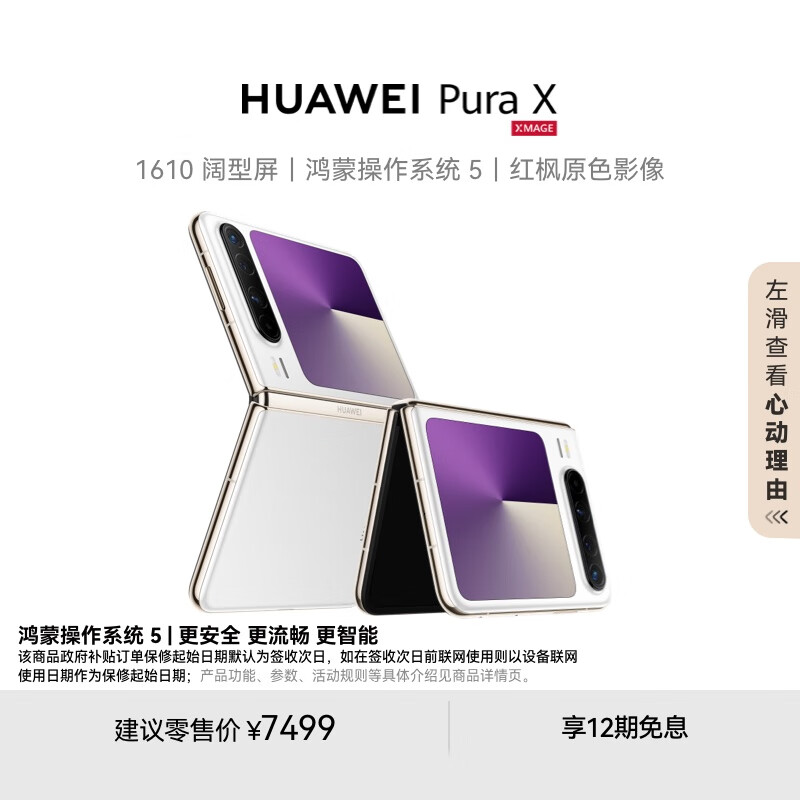 华为的一款折叠屏手机,存储为12GB加256GB,颜色是零度白,屏幕为1610阔型屏,搭载鸿蒙操作系统,具备5红枫原色影像,型号是Pura X 。