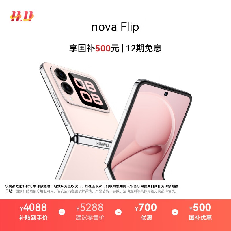 华为一款名为nova Flip的具备小折叠特点的智能手机,享国家补贴500元,拥有256GB存储容量,呈现樱语粉外观,具备轻薄且可靠的特性,搭载鸿蒙系统并拥有AI趣玩功能,后置5000万像素且支持悬停自拍 。