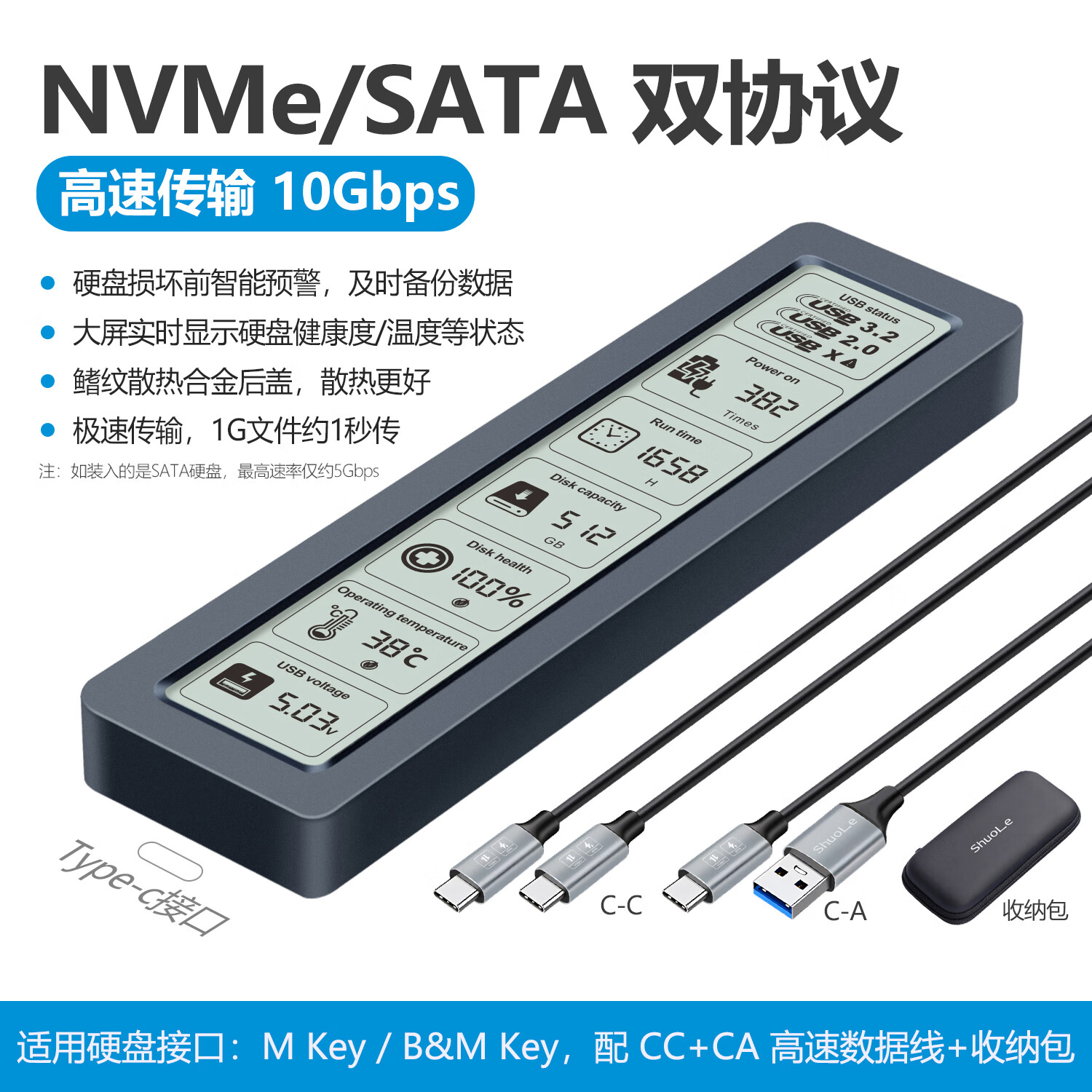 属品牌直营范畴,硕乐所产智能数显的m.2固态SSD硬盘盒,用于m2笔记本,遵循NVME协议,具备SATA转接双协议,且还有附加特性 。