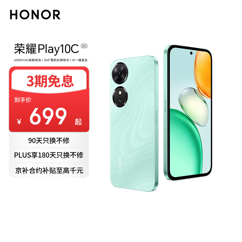 那种被称作荣耀的,具备5G功能且带有AI能力的手机,有着高能的电池,拥有360°全方位对于整机抗摔防水的特性,还有AI一键直达的便捷,配置为6加128存储组合,呈现天海青的外观色泽,并且享受国家补贴。