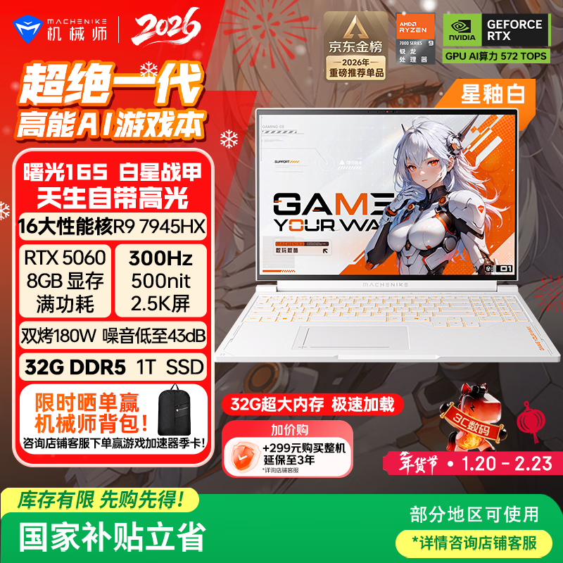 在京东自营售卖的,机械师品牌的曙光 16S系星釉白色泽款,具备300Hz屏幕的,有着16英寸尺寸的,用于AI办公以及游戏的笔记本电脑,享受国家补贴。
