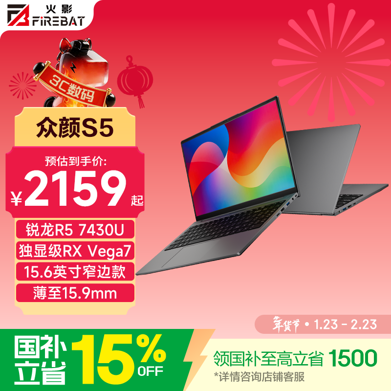 京东自营的,火影众颜的,S5锐龙5的本子,是高性能轻薄本,15.6英寸的,用于办公商务的,笔记本电脑,有国家补贴20%,对应的型号是R5 - 7。