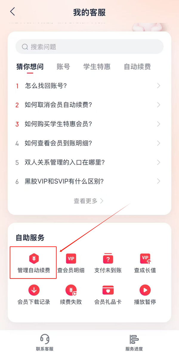 3、在客服中心的自助服务中找到【管理自动续费】。