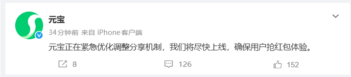 在此情况之下,元宝的官方微博紧接着就发布了相关内容,其表示:正在以紧急的状态去优化调整分享的机制,我们会以尽快的速度将其上线,以此来对用户抢红包体验提供保障。