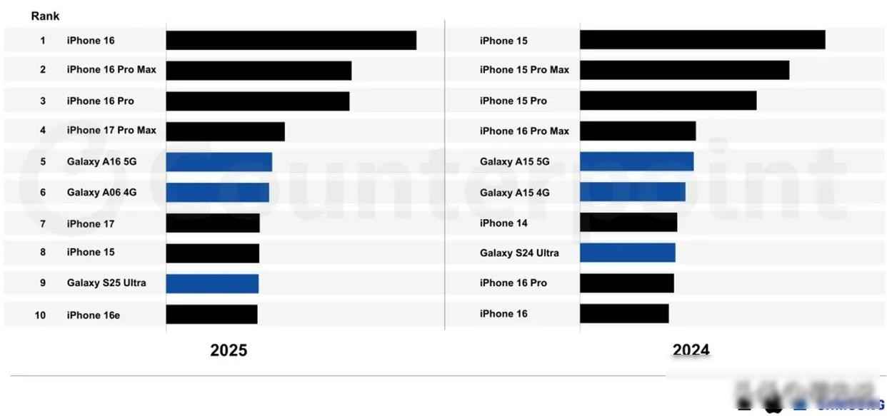 16系列在2025年秋天,17发布之后,其销量反而比17还要高,这表明许多人购买16之后,根本没有着急去更换,第8名的15已经售卖了两年多,仍在全球各个地方被大量使用,用户如今更加看重能够使用就行,而非最新最贵的,我身边有好几个朋友手中的14还没有损坏,根本不打算去更换。
